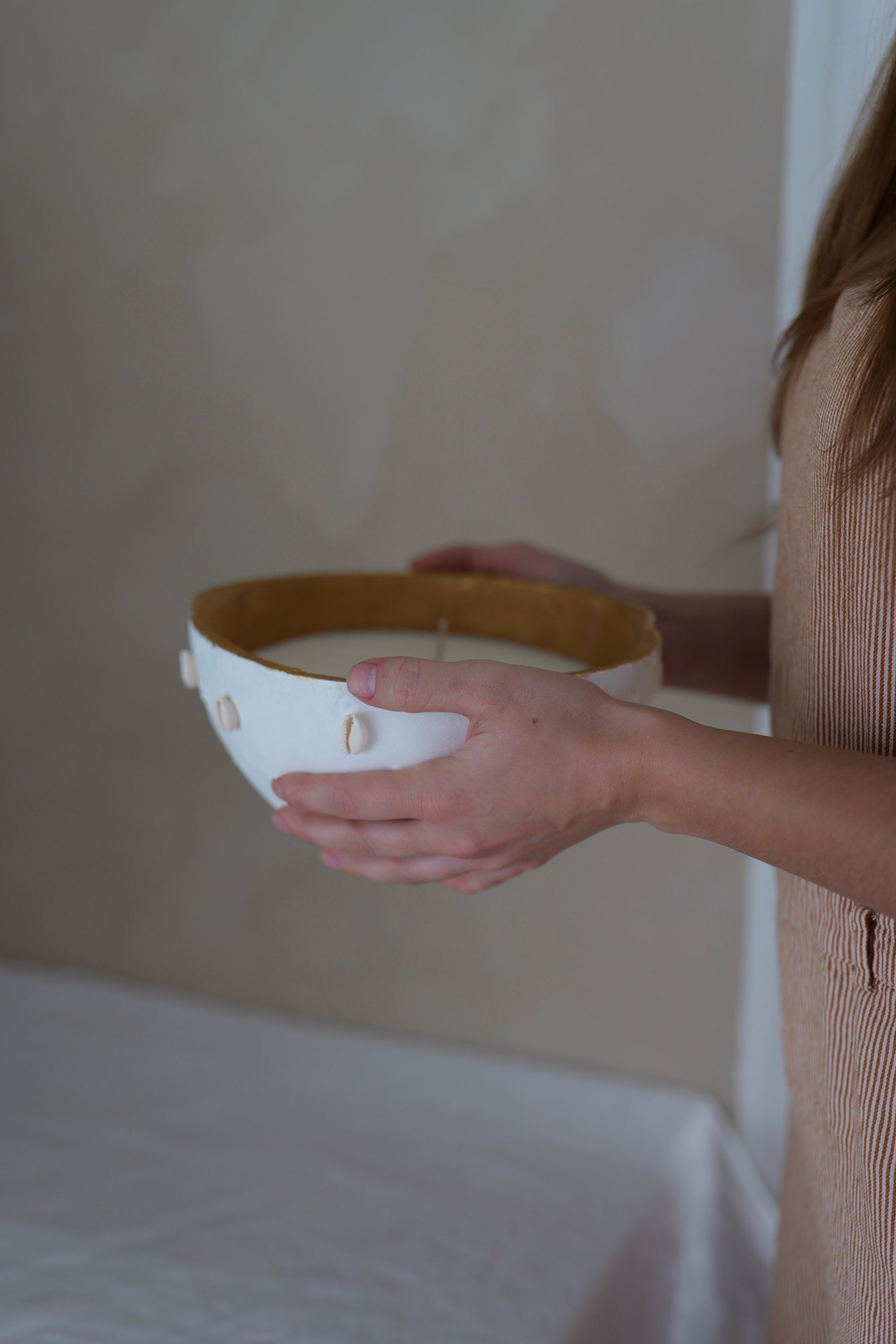 Matériaux : Calebasse et cauri, cire de coco et soja et parfum exclusif Atelier 22B crée par nos maîtres parfumeurs de Grasse, aux notes d'iris et de musc végétal