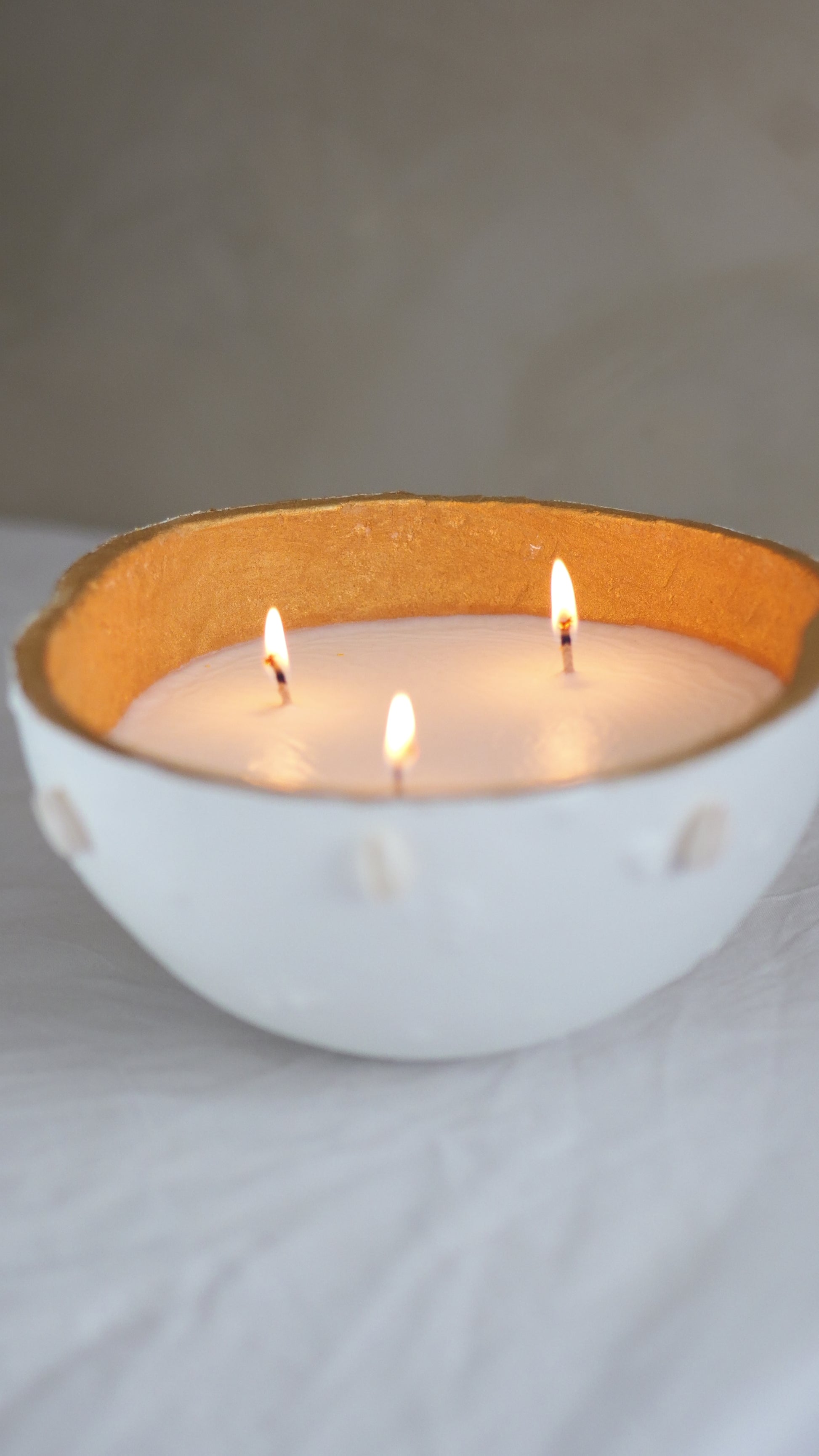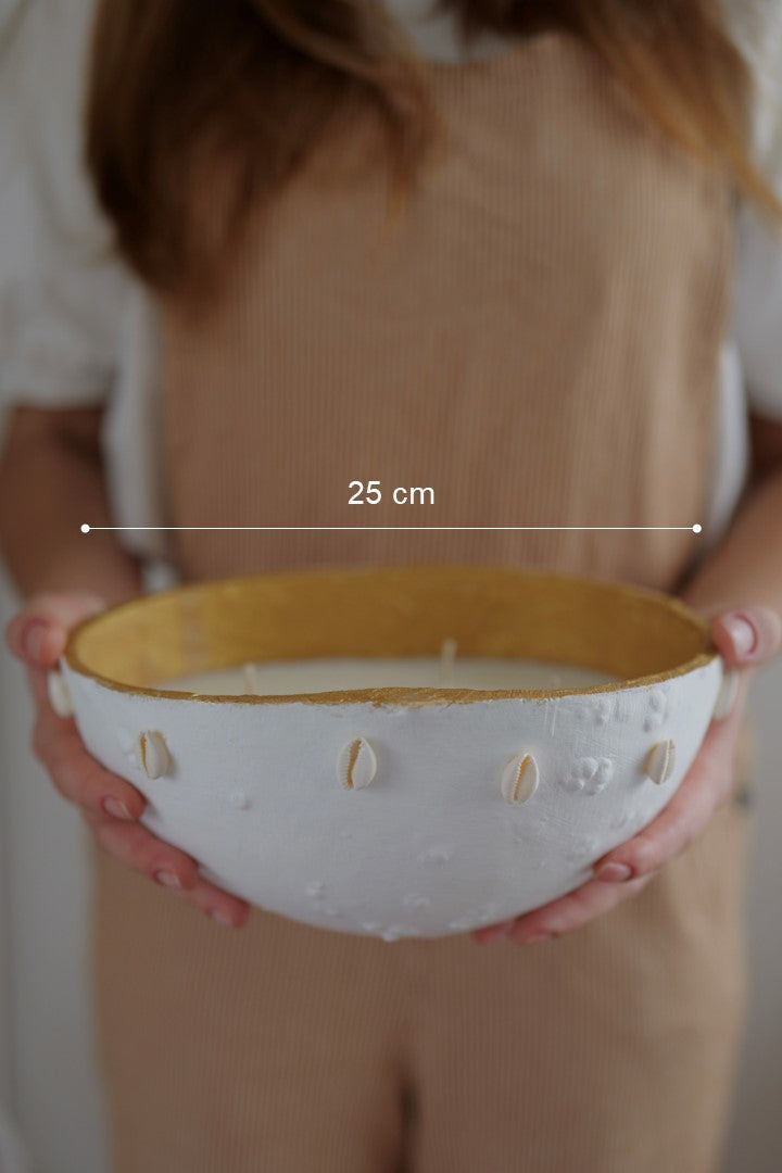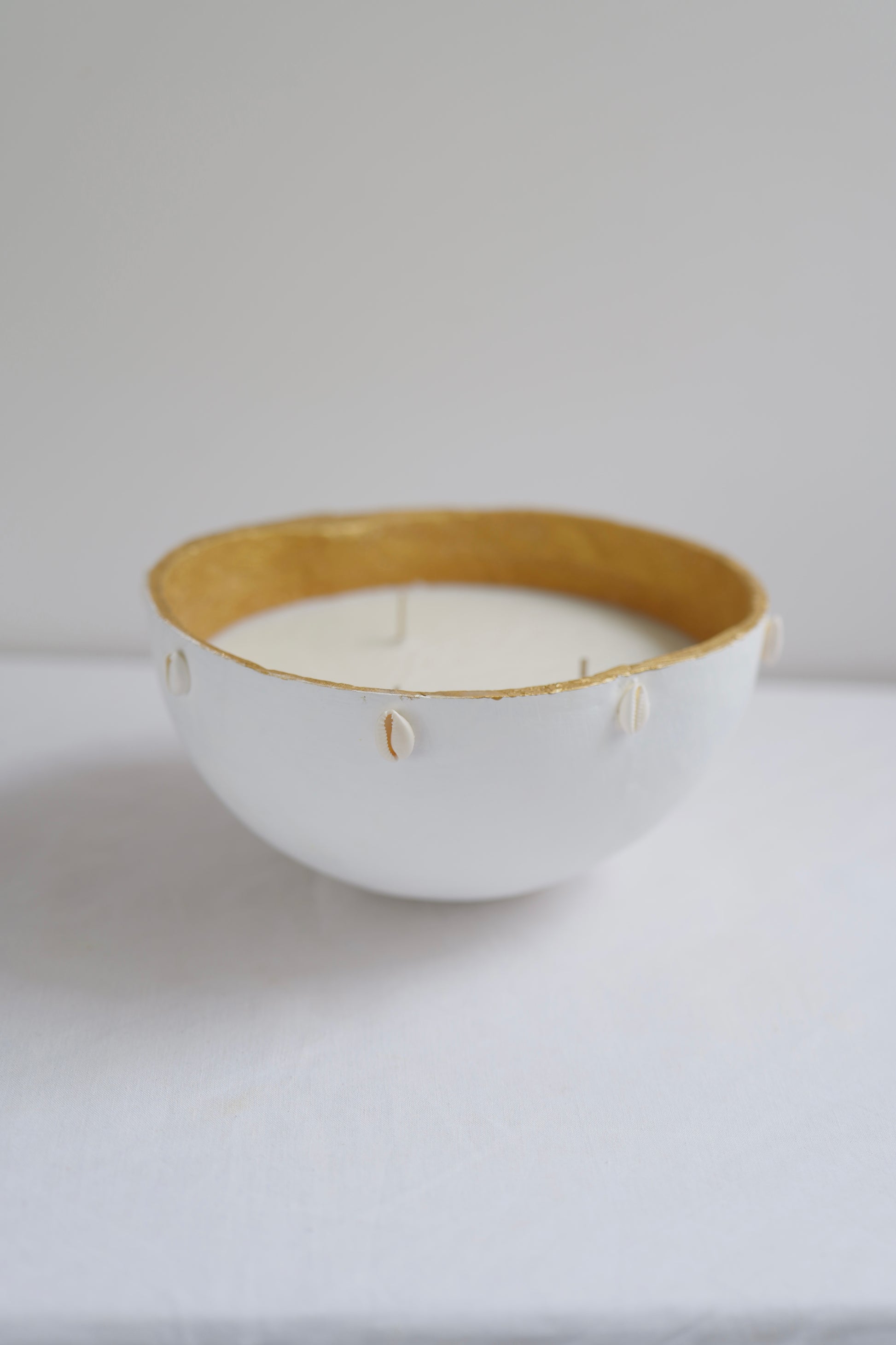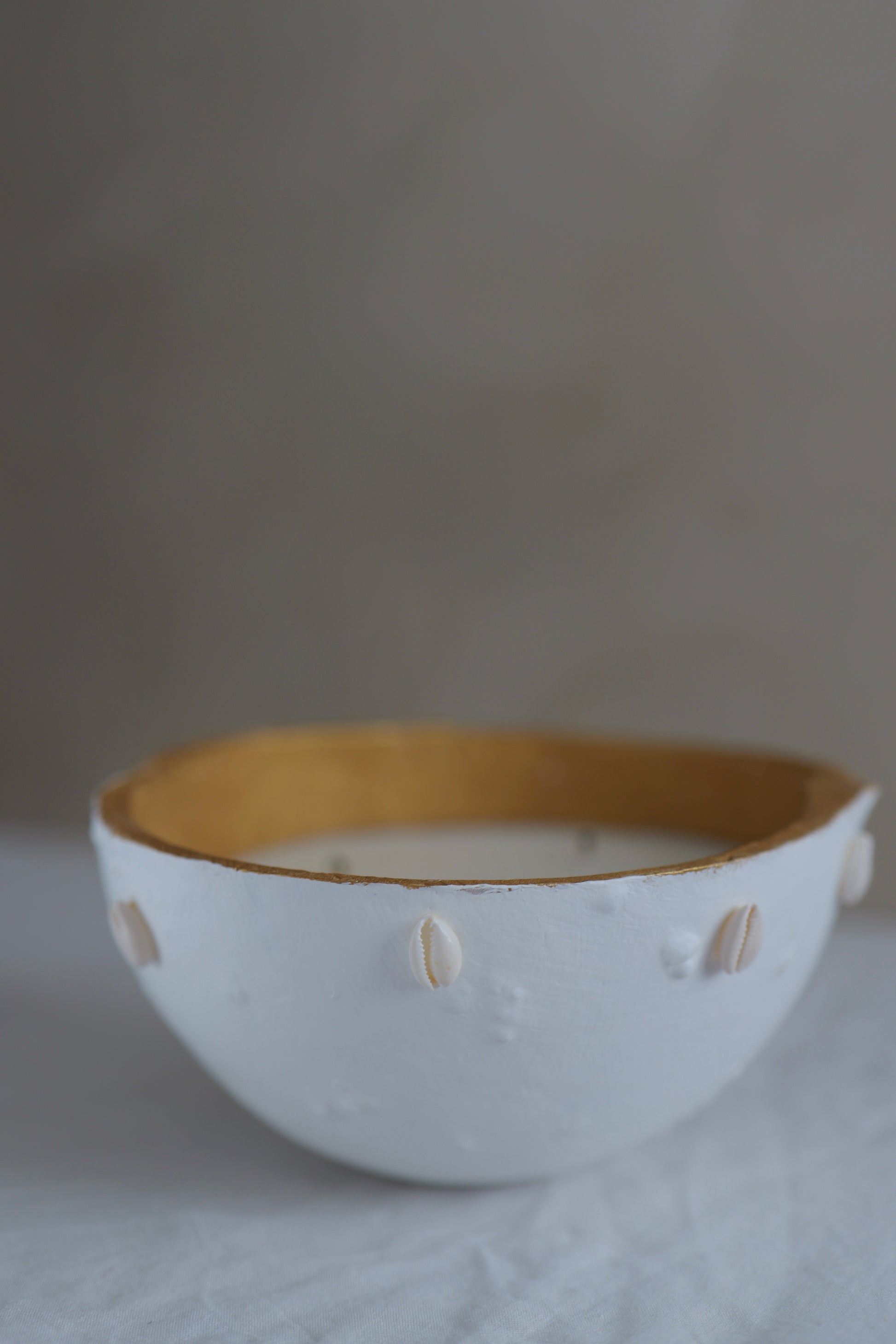 Fabriquée à la main avec soin, le design unique de la bougie "Enjaillement" associe une calebasse africaine finement dorée ornée de cauris à une cire végétale de coco et soja offrant jusqu'à 150 heures de combustion.