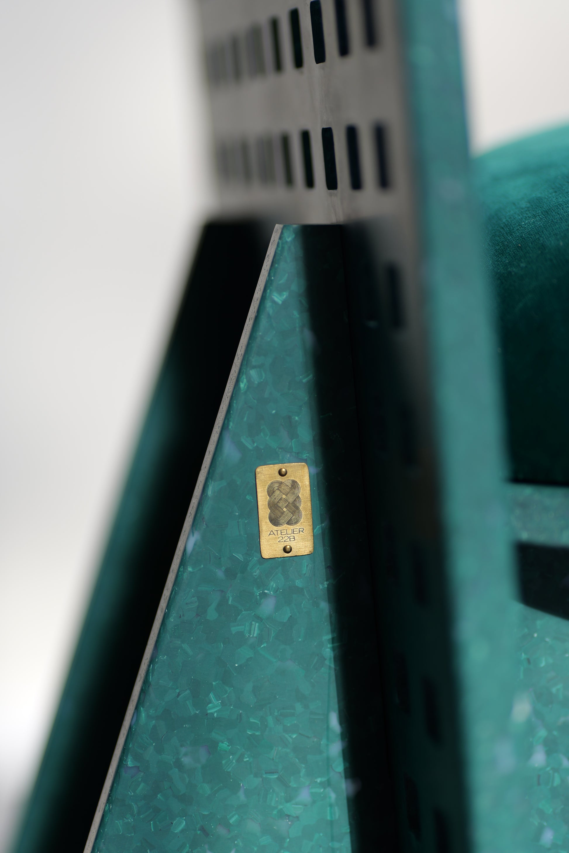 Avec son coussin en mousse haute densité certifiée, habillé d'un tissu en velours vert sélectionné par Atelier 22B, elle garantit dans sa conception une qualité technique pour assurer un confort irréprochable.